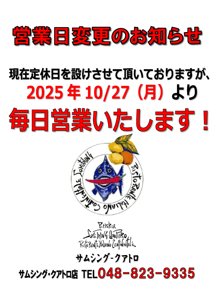 【サムシングよりお知らせ】【営業時間のお知らせ】